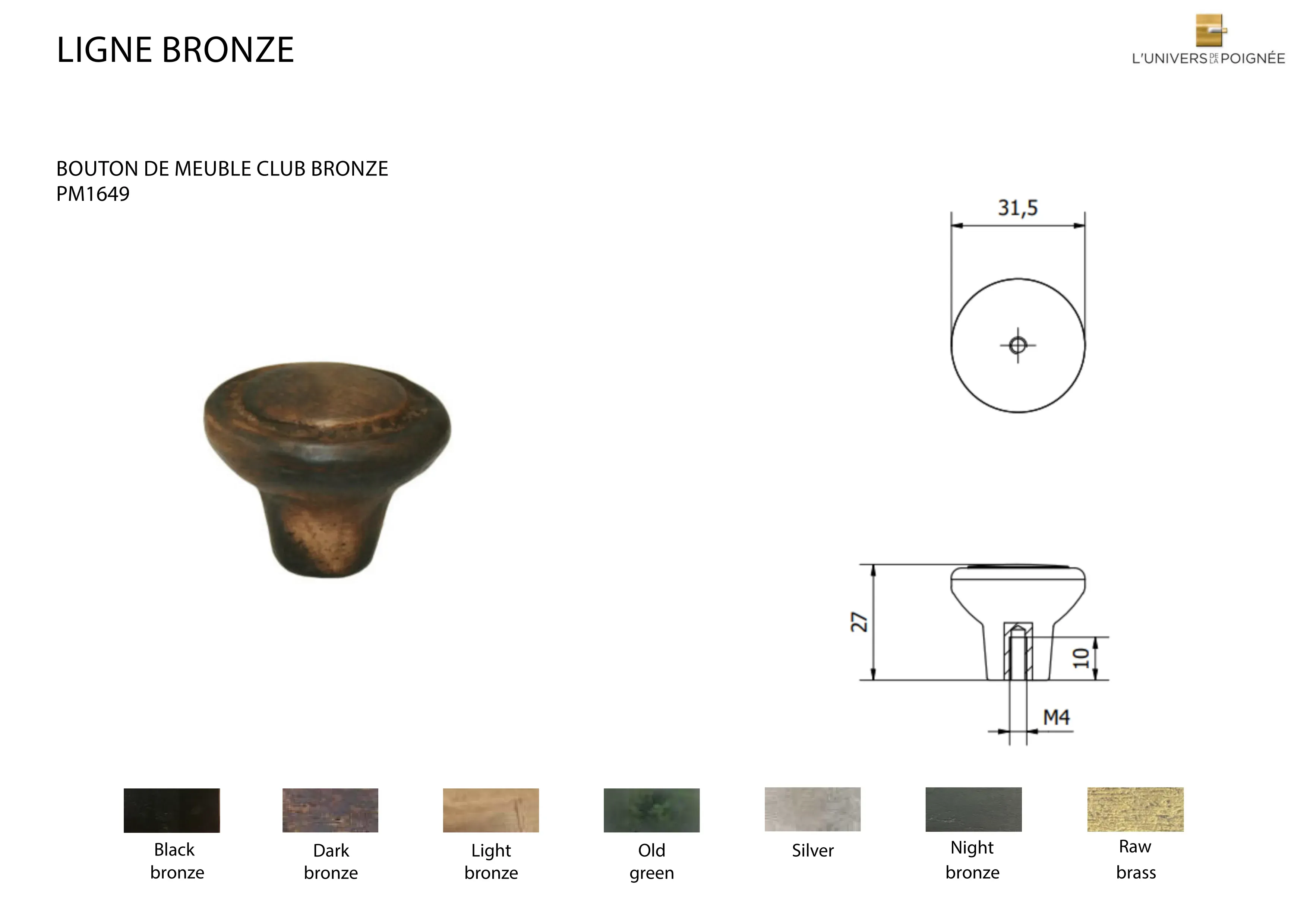 Parce que le bronze est un matériau vivant, ce modèle est proposé avec des patines spécialement développées, qui lui permettent d’acquérir une patine naturelle au fil du temps et de s’embellir avec l’usage. Elle peut également être déclinée avec les finitions du laiton, bien que des variations de teintes puissent apparaître par rapport aux collections en laiton classique.