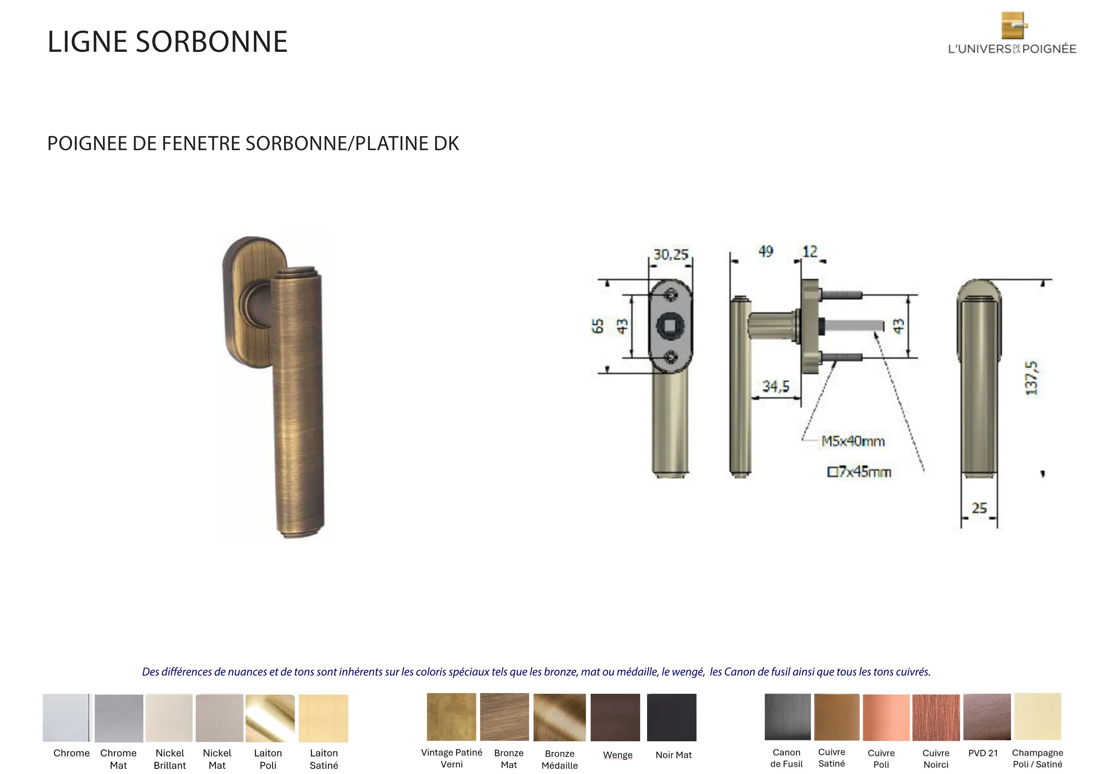 Parce que chaque intérieur mérite une finition sur mesure, la poignée de fenêtre Sorbonne est disponible en plus de 15 coloris différents, parmi lesquels : Laiton satiné ; Laiton poli ; Chrome mat ; Chrome brillant ; Nickel mat ; Nickel brillant ; Bronze mat ; Bronze médaille ; Bronze vintage ; Wengé ; Blanc ; Noir mat ; Canon de fusil ; Cuivre satiné ; Cuivre brillant ; Cuivre noirci ; Champagne mat ; Champagne brillant