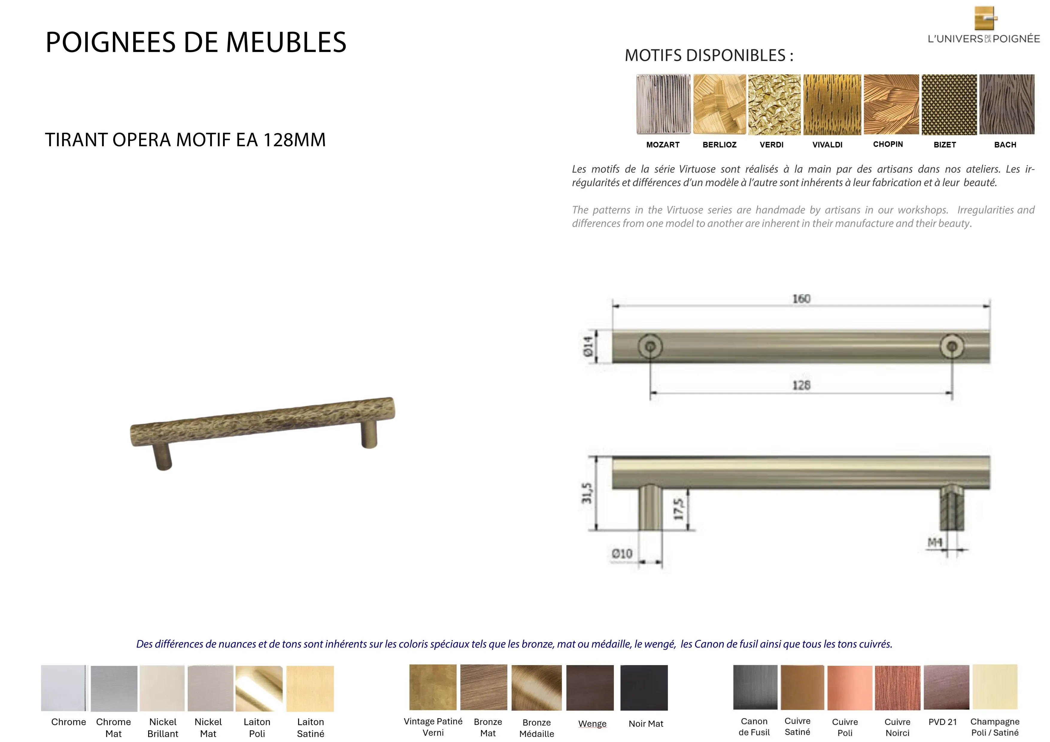 Parce que chaque intérieur mérite une finition sur mesure, le tirant est disponible en plus de 15 coloris différents, parmi lesquels : Laiton satiné ; Laiton poli ; Chrome mat ; Chrome brillant ; Nickel mat ; Nickel brillant ; Bronze mat ; Bronze médaille ; Bronze vintage ; Wengé ; Blanc ; Noir mat ; Canon de fusil ; Cuivre satiné ; Cuivre brillant ; Cuivre noirci ; Champagne mat ; Champagne brillant