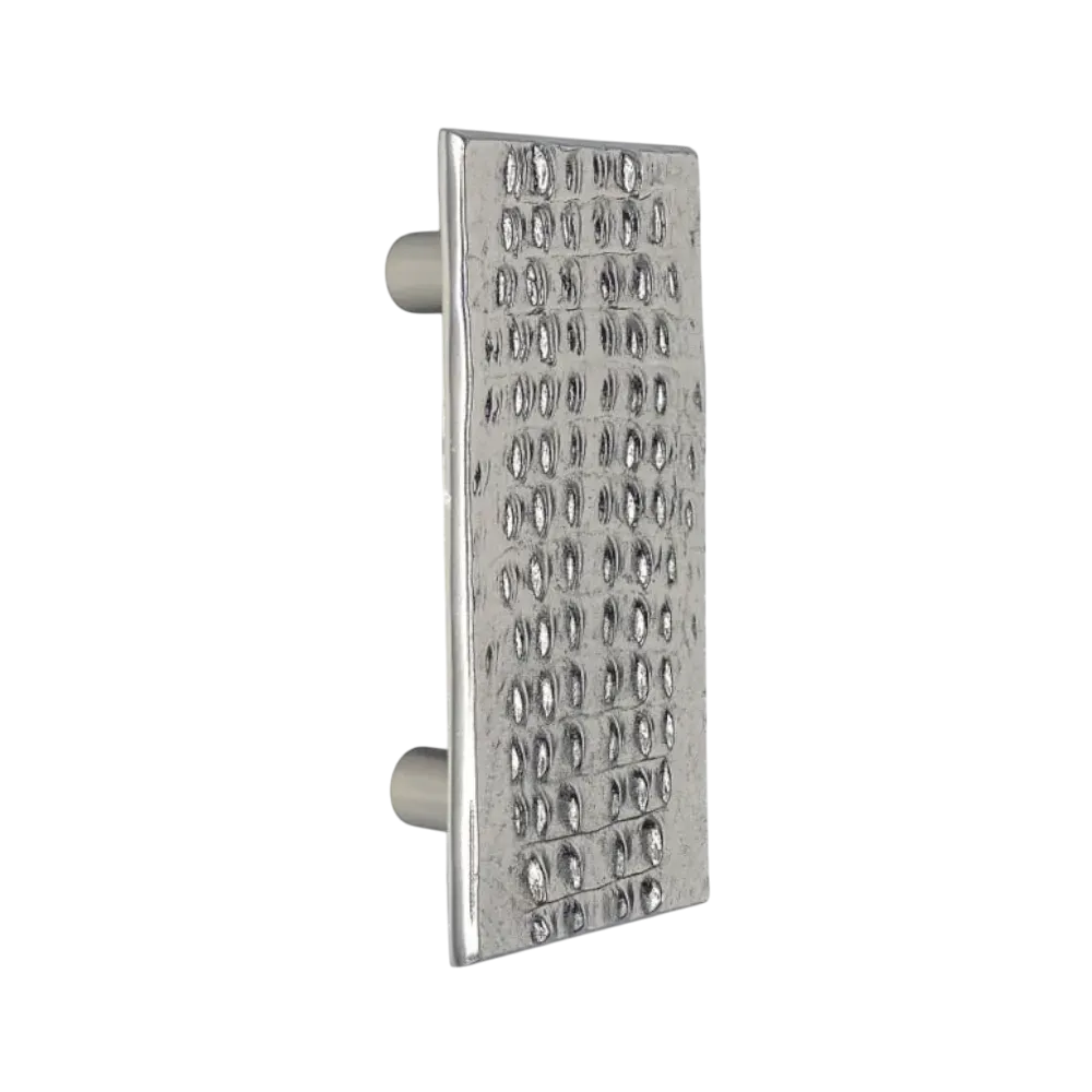 La plaque de tirage rectangle Croco 200x100 mm est un modèle en bronze au format compact, conçu pour habiller aussi bien les portes de communication que les façades de meubles. Réalisée à partir d’un moule original créé par un sculpteur, elle reproduit fidèlement l’empreinte d’une véritable peau de crocodile.